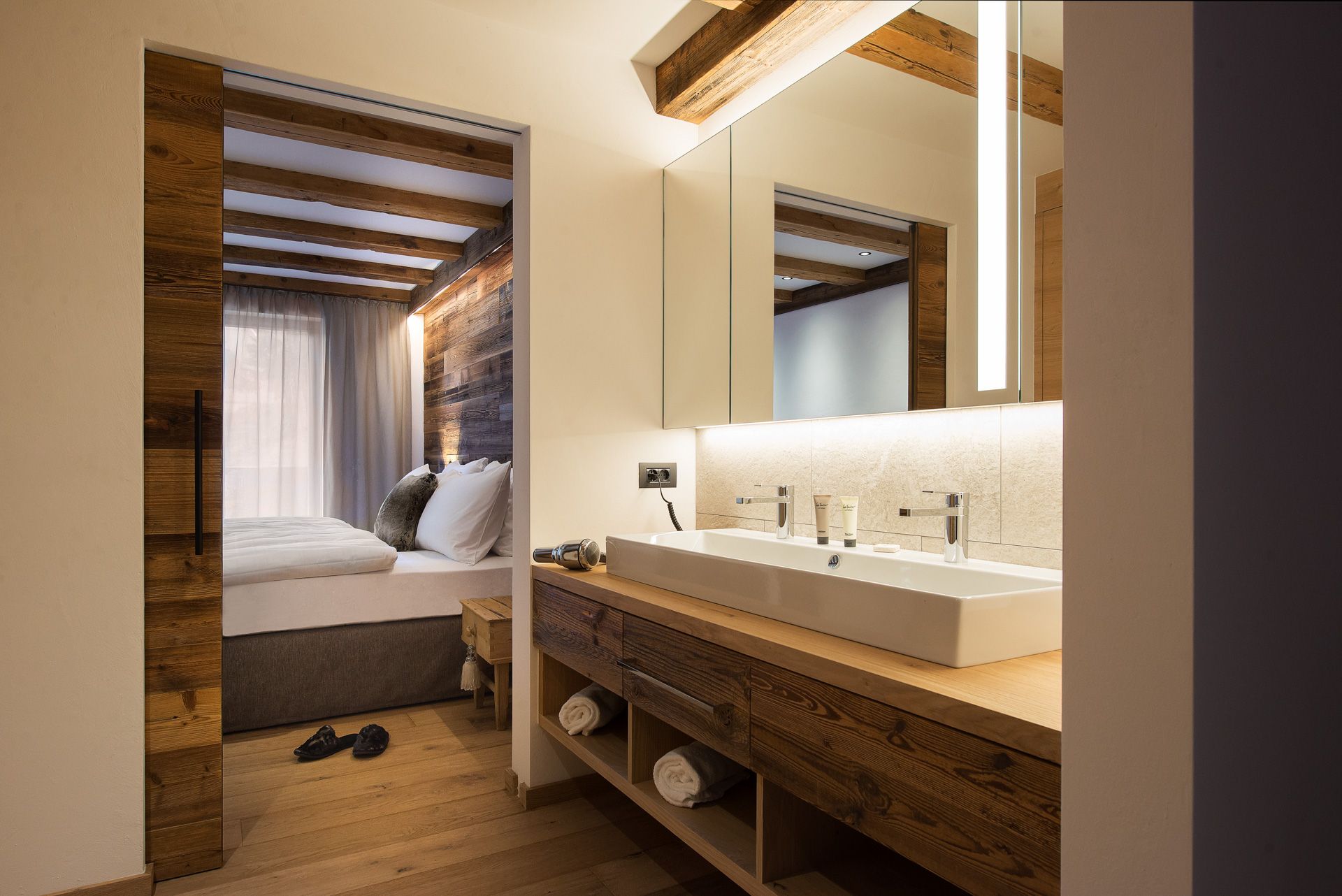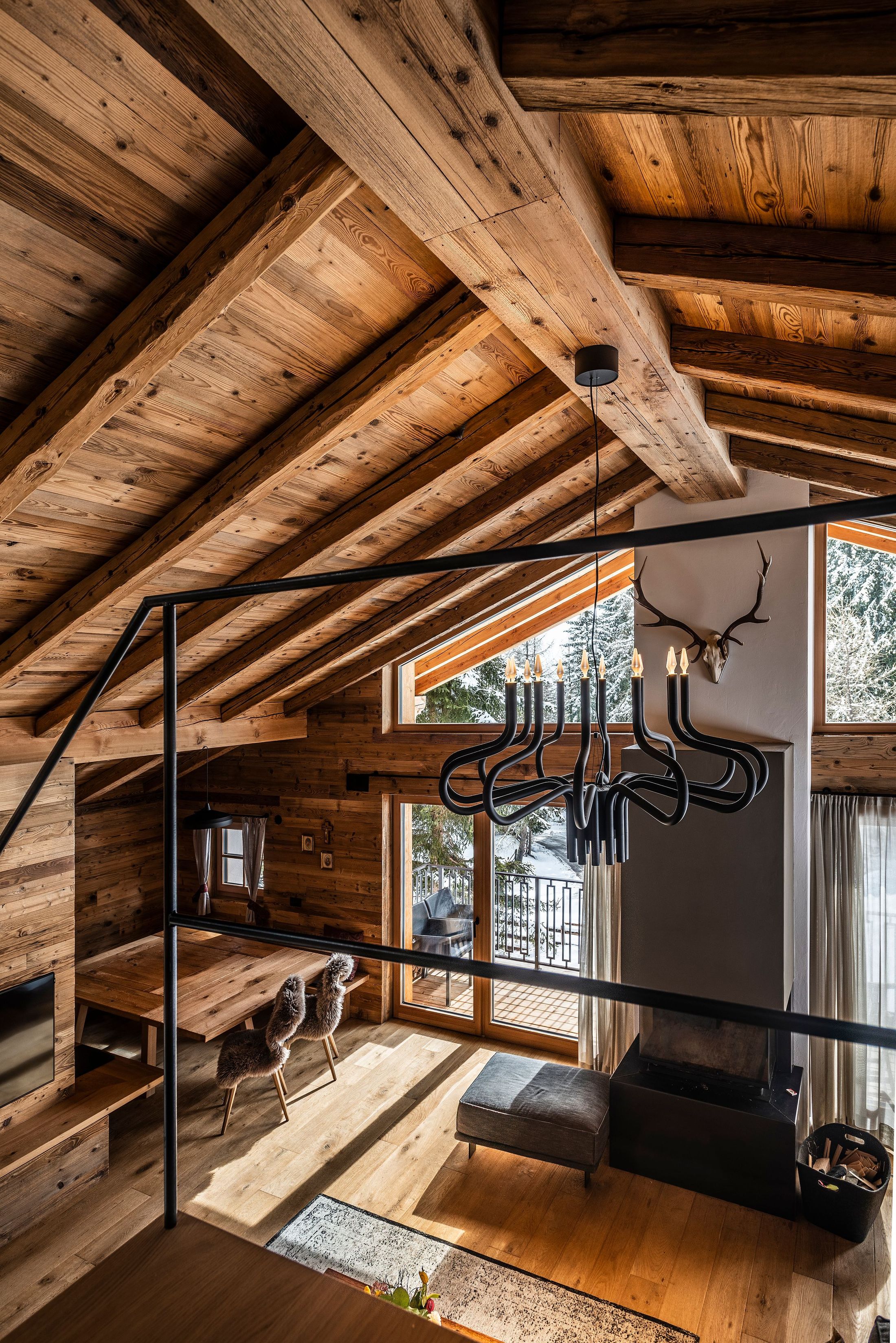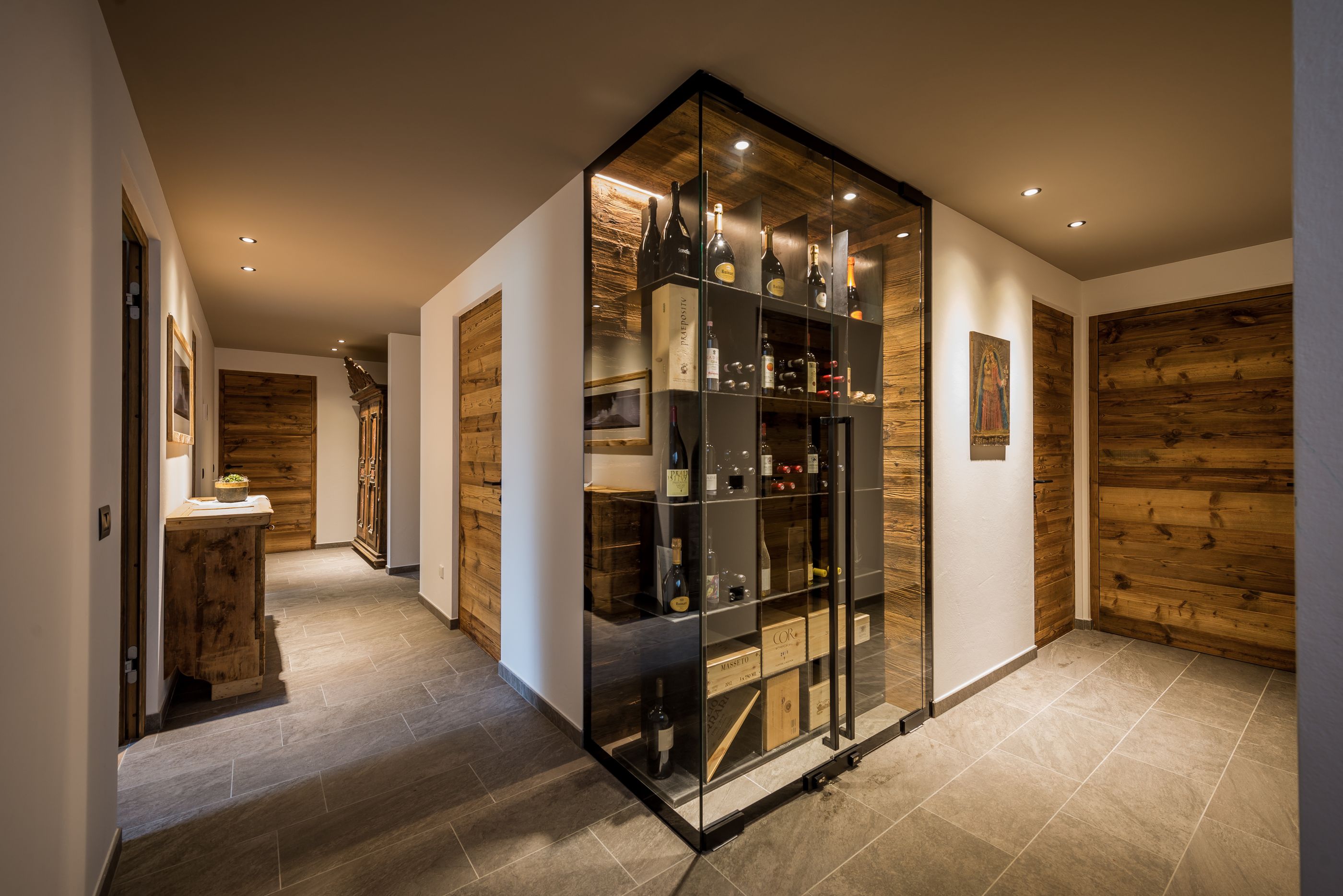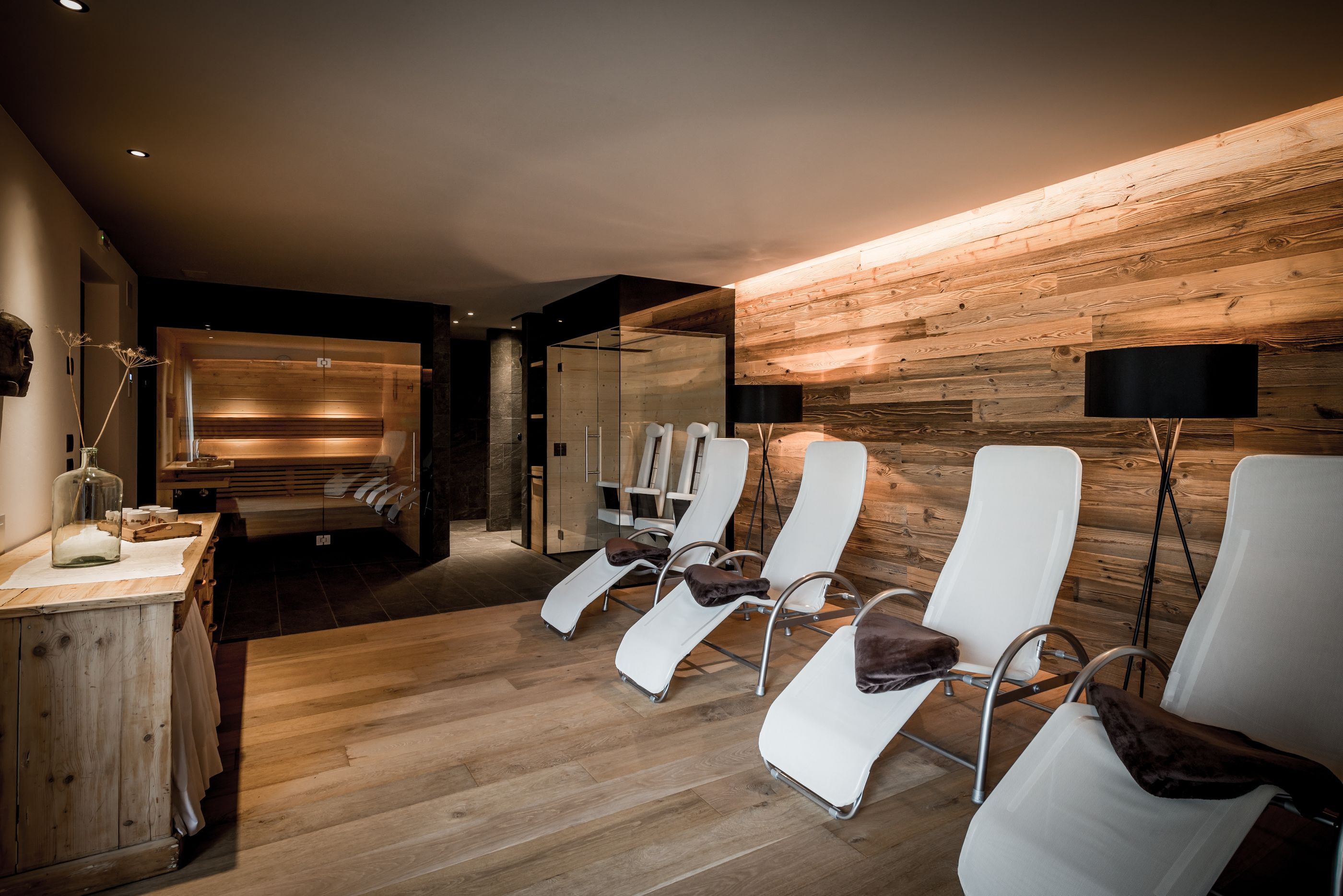 The spa area features a Finnish sauna, an infrared cabin for two, a rain shower and a jet shower, and also a relaxation room. Two bedrooms with a toilet and bath, a spacious double bedroom with an en-suite bathroom, a wine cabinet with exquisite wines and a fully heated ski room directly accessible from outside complete the diverse ground-floor accommodation. On this floor, there is also a ski storage room with ski boxes and heated ski-boot dryers which is directly accessible from the parking area.